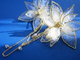 白いプリンセチア,クリスタルスノーをディップアートのタックピンにしました。花言葉は思いやり。二つのプリンセチアは取り外し可能なチェーンでつなげて二つ並べてブローチにしたり一つを帽子に留めてハットピンにしたり自由にアレンジしてください。クリスマスシーズンにぴったりのアクセサリーです。普段使いでもパーティ―でもお使いいただけます。