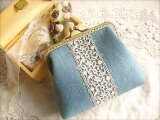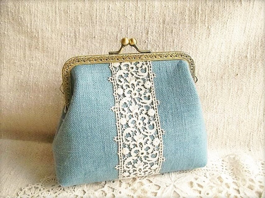 シックな色合のサックスリネンにアンティークレースをのせたがま口ポーチ