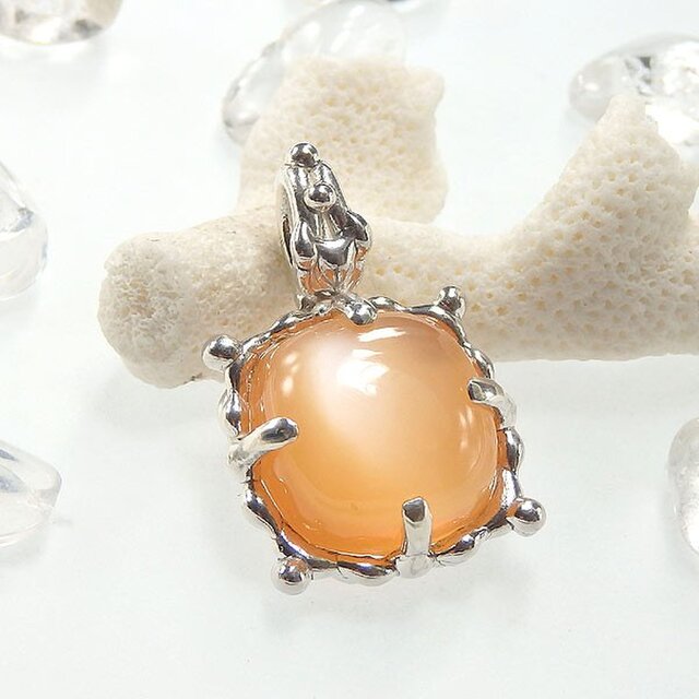 オレンジ色のふっくらとした形が可愛らしいムーンストーンを、粒飾りのペンダントに仕上げました。