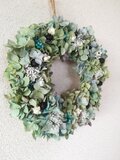 爽やかな色合いのコントラストの綺麗なブルーのあじさいに、鮮やかなブルーのかすみそう、真っ白なかすみそう、アンモビューム、濃紺のシャリンバイの実をアレンジしたナチュラルでシンプルなリースです。