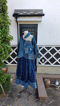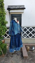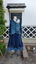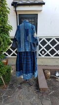 たっぷりの縞(チェック)に裾に型染めを使いスカートを作りました。