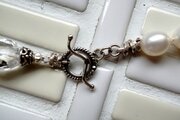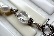 留め金は、わっかマンテルです。バー(棒)の部分がかもめのような形になっているのがチャーミングでしょう?(笑)。水晶と共に見える位置に出しておつけいただければと思います。留め金部分を首の後ろにまわしておつけいただけばシンプルなパールのネックレスになりますよ。