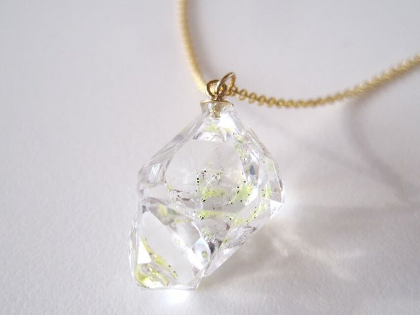 オイルインクォーツ:パキスタンやアラブ諸国で産出される非常に希少な天然の両錐水晶で、水入り水晶のような構造になっています。透明度の高い結晶の中に、蛍光性をもった美しいイエローのオイル(石油)が、水晶が成長する際に内包された、大変珍しい天然石です。ブラックライトを当てるとオイルの部分が青白く蛍光します。