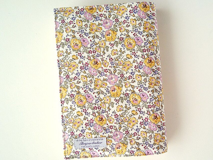 リバティの人気生地、フェリシテ Felicite(イエローピンク)とハーフリネンの生地でビジネス書サイズのブックカバーを作りました。