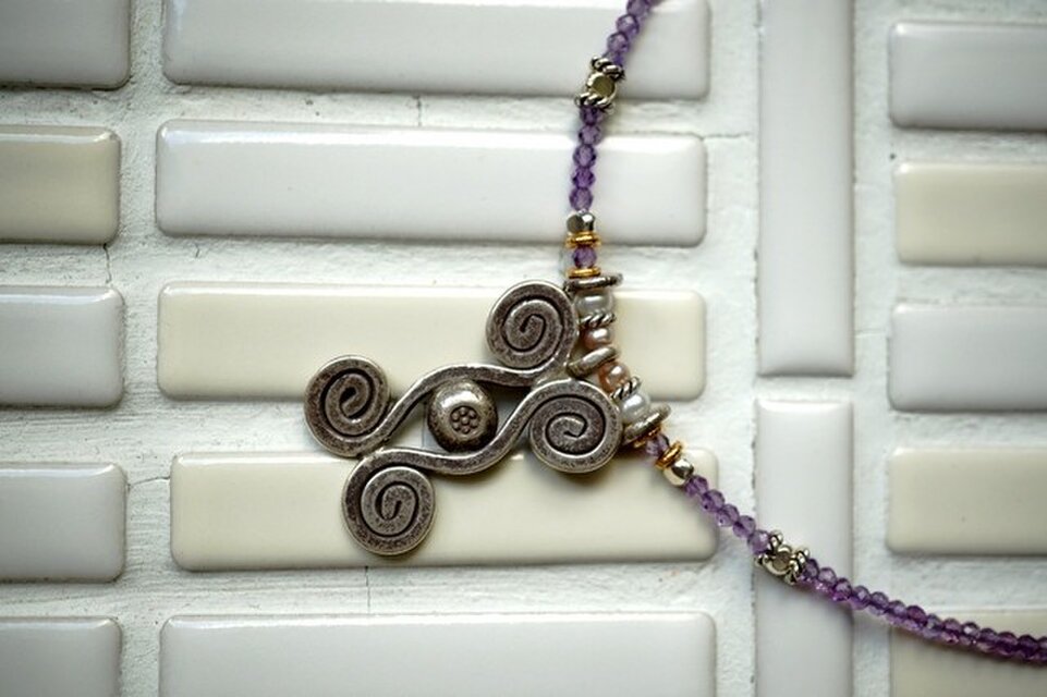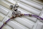 アメジストがメインのネックレスですが、前中央部分には(カレントップの両サイドには)小粒パールやゴールド&シルバービーズなどアクセントに挟んでいます。