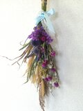 シックな色合いのセイバンモロコシ、二種類のラグラスに、瑠璃たまアザミ、アンモビューム、千日紅などをアレンジしました。