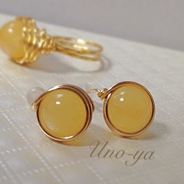 ふんわり たまご色のアラゴナイトを14kgf ゴールドワイヤーで包んだ一粒ピアス♡