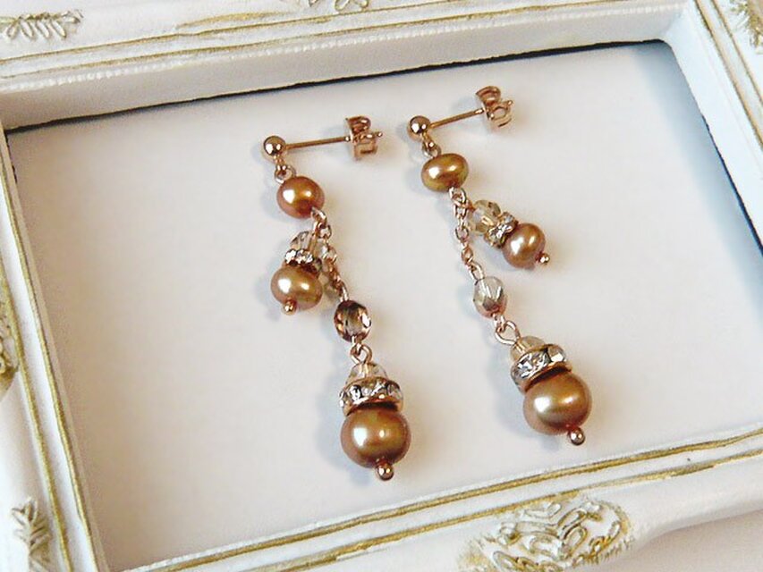 ブラウン系の淡水パールとピンクゴールドカラーで作ったフェミニンスタイル。