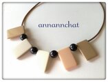 とても美しい艶のある長四角の素材は 約40mm×25mmで ホワイトアイボリー、ペールピング、ライトグレー、サンド の各色を組みあわせ、その間には ブラックネイビーの球形のビーズをはさみこんでおります。