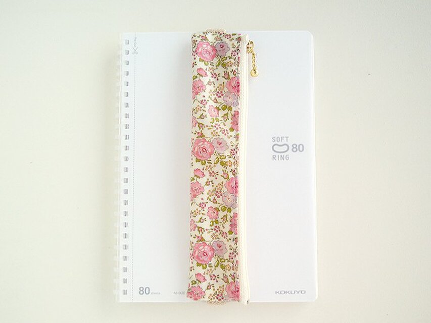 リバティの人気生地(ラミネートつや無)、フェリシテ Felicite(ライトピンク)でペンケース(A5サイズ用ゴムバンド付き)を作りました。