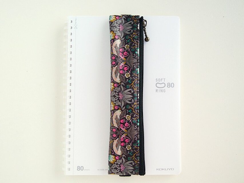 リバティの人気生地(ラミネートつや無)、 Strawbery Thief ストロベリーシーフ(ダークブラウン)でペンケース(A5サイズ用ゴムバンド付き)を作りました。
