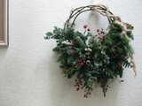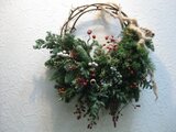 フレッシュなモミなどのエバーグリーンをベースに野バラの実やマウンテンジュニパーの実を散りばめた、バスケット型のクリスマスリースです。