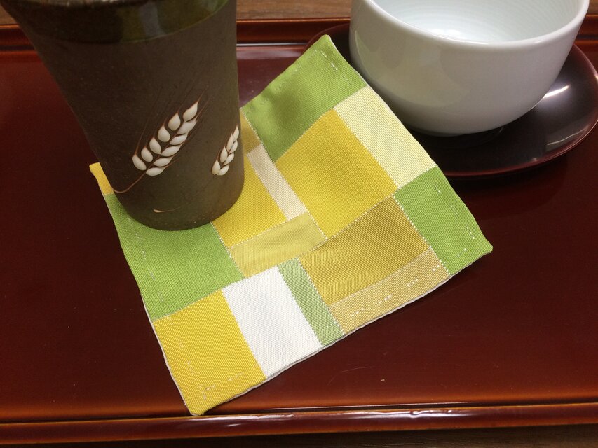 韓国パッチワーク、ポジャギの技法で作ったコースターです。素材は絹。ミョンジュという厚手の絹です。大きさは11センチの正方形。かびん敷や小物をのせたりしても。