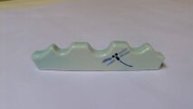 磁土で成形し、呉須を染め付け、薄い青磁を掛けて本焼きしています。