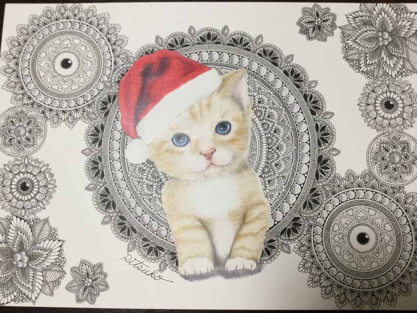 原画 肉筆 一点もの ボールペンアート サンタクロース クリスマス Xmas 猫 小猫 仔猫 ボールペン画 絵画