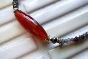 中央のカーネリアンの両サイドにはシルバーやゴールドのビーズ、ブラウンのパールなどを挟み、落ち着いた中にも華やかさをプラスしてみました。