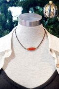 長さ3cm、長いライス型のカーネリアンを中央に1粒、ネックレス部分にはスキャポライトのボタンカット型3mmを使ってネックレスを作りました。