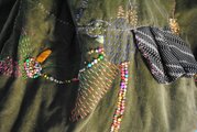 カーキ色のベロアのような生地にビーズや刺繍で、色を入れました。