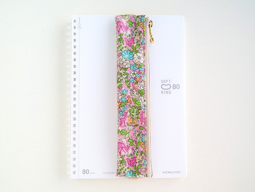 リバティの人気生地(ラミネートつや無)、ファーガス Fergus(ピンク)でペンケース(A5サイズ用ゴムバンド付き)を作りました。