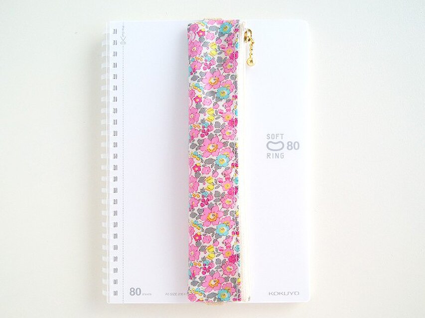 リバティの人気生地(ビニールコーティングつや無)、 ベッツィ・アン Betsy Ann(ピンク)でペンケース(A5サイズ用ゴムバンド付き)を作りました。