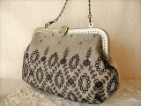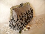 エクリュリネン(淡いベージュ)にアンティークブラックレースをのせたがま口バッグ
