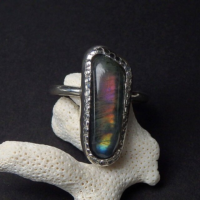 様々な色合いの美しい光が浮かぶラブラドライトを、シンプルなリングに仕上げました。