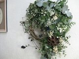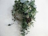 小さな葉と大きな葉、2種のユーカリに粉雪のように白い花や実物を散りばめました。
