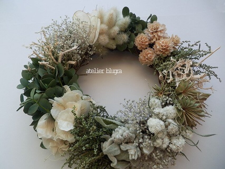 八ヶ岳の夏の日をいっぱい浴びたラムズイヤー、ヤマハハコ、ラグラスバニーテールなど柔らかな素材でふわふわなWreathを作りました。数年ほど経ちますといい感じのセピアになります、ドライフラワーならではの移りゆく姿をお楽しみください。