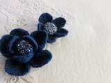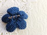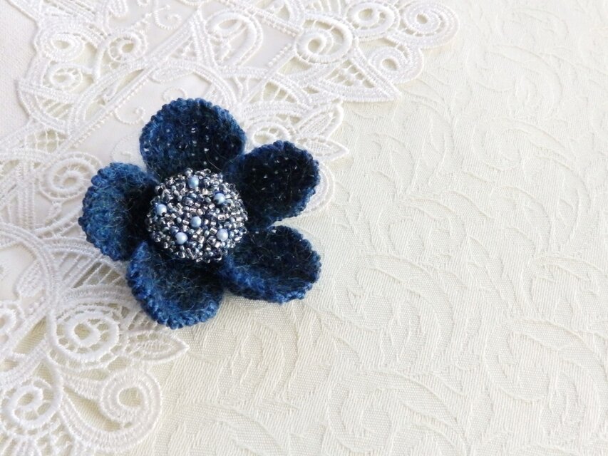 ブルーミックスのキッドモヘアと紺色のシルクウールを編み機で編んだニットのブローチです。