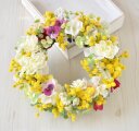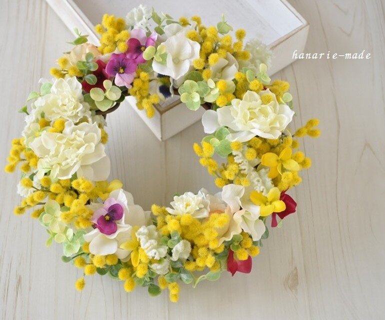 リース土台:ナチュラル素材 直径約20センチ リース素材:アーティフィシャルフラワ-(造花):ミモザ・八重咲き水仙・ビオラ・パンジー・紫陽花・ユーカリ、など。その他:リボン飾り、など。