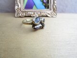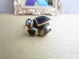 5×6高さ3mmのアクアマリン 7×3高さ3mmのアメシスト 5×4mm高さ3mmのぺリドット 直径3mmの淡水パールを覆輪留めした 幅2mmの甲丸リング(8~15号位のアジャスタブル)全体真鍮ソリッド メッキ無し 硫化時はピカールで磨くときれいになります。石はタンブル(かなり磨かれて 表面ツルツル)