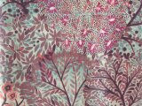 生地の色は地の色が、ライトグリーン、木々や花の色にブラウン、オレンジ、ピンクパープルなどが使われています