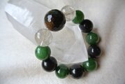 直径約20ミリの大玉、ミラーボールカットのブルータイガーアイをメインに、両側に約17ミリの虹入りルチルクオーツ、約16ミリのグリーンアゲート、約18ミリのキャッツアイオブシディアンを交互に組み合わせたスペシャルなパワーブレスです。サイズは内計15.5センチ(サイズ変更可能)。