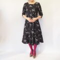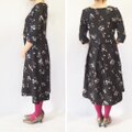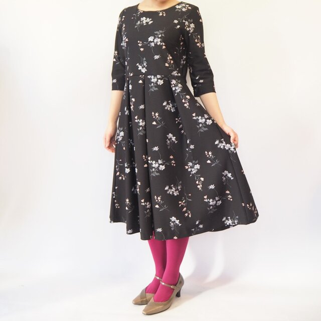 ・光沢のあるブラック生地にお花の柄がプリントされた上品な一枚。厚みとハリがあり、身体のラインを拾わずに綺麗なシルエットを作ってくれます。