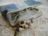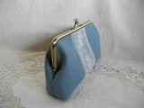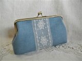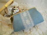 サックスリネンにアンティークレースをのせたがま口ポーチ