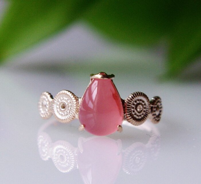 上品なサーモンピンク、つやつやで透明感のあるインカローズのK10製リングです。