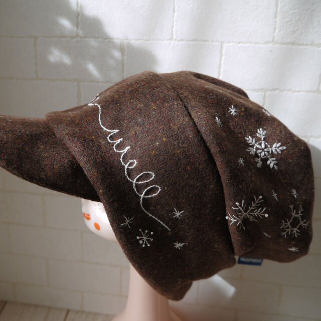 ツイード加工ウール混ニゥット生地で作ったニットキャップ(雪柄)