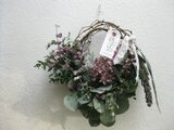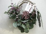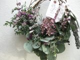 この時期美しいユーカリのシルバーグリーンに、紫とピンクのグラデーションをふんわりとあわせた、春の色のリースです。