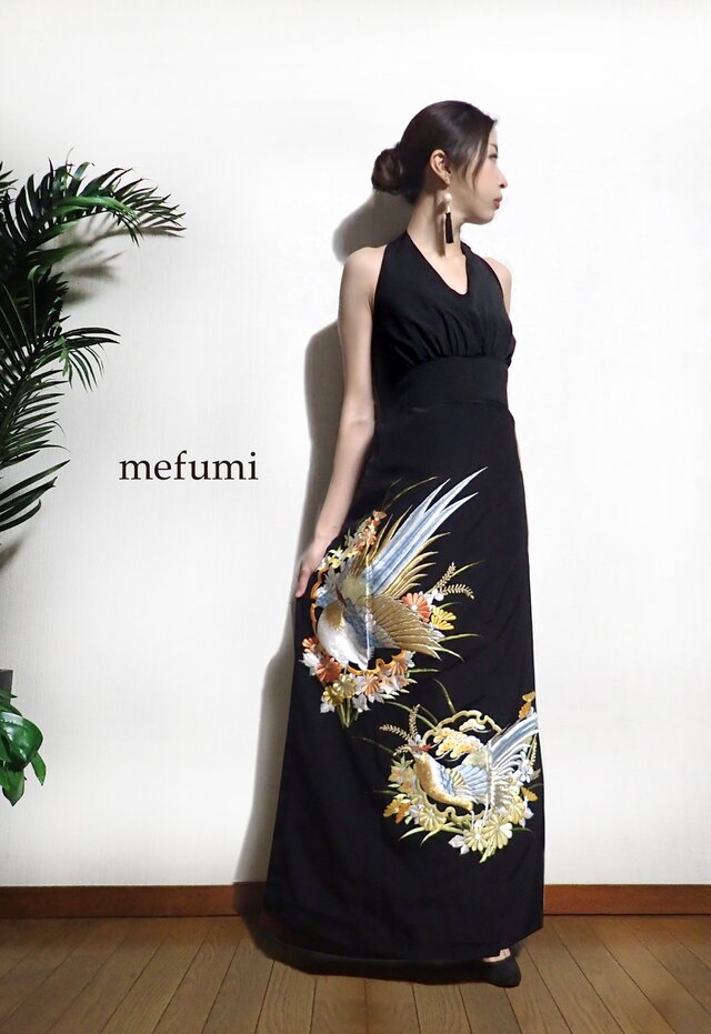 総刺繍で彩られた華やかで優美な花鳥が素敵なアンティーク着物をほどいて、フォーマルワンピースを作ってみました。