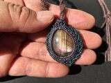 ラブラドライトのルースを蠟引き紐(ワックスコード)で装飾し、ネック部分は肌触りも良く安心のナチュラルヘンプで仕上げました。