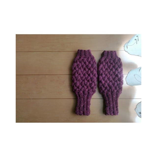 編み地がもこもこしていて、色が地味でもとってもかわいい作品。デザイン的に、家の中でも手首をあたためることができ、重宝しています。