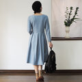 ・肌触りの優しいコットンのデニムライクな生地です。厚みがありますが、ストレッチ性は高め。適度なハリがあるので、スカートが立体的に綺麗に広がります。しっかりした生地なので、秋、冬、春におすすめです。