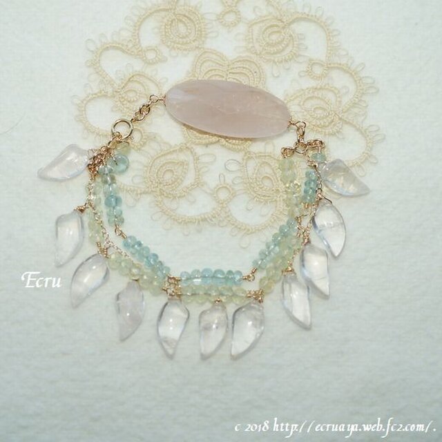 宝石質アクアマリンAAAとプレナイトAAAとチェーンで三連を作り、ローズクォーツに繋いでいます。