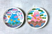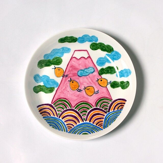 イラストのようなポップな感じの富士山と千鳥と波と雲をモチーフにした絵柄を4cmの深皿に描いた器です。
