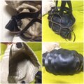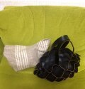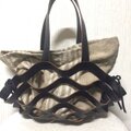 ハードな黒の牛ヌメ革を丸く裁断して切り目を入れて蛇腹にしたかご風バックです。