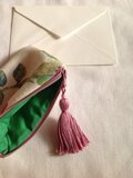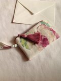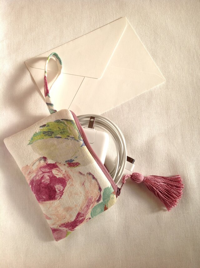 きれいな作品ありがとうございました。布の色に合わせたタッセルがかわいいです。▼フラットポーチは、今使っている8インチのタブレットにぴったりの大きさです。こんなかわいいポーチから、大きなタブレットがでてくる意外性?▼取っ手付きしっかりめポーチは、着物を着たときの小バッグにします。浴衣でも使えますね。