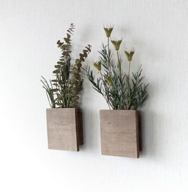 壁面に取り付けられる自家製古木風で立体感のある器にドライフラワーをアレンジしています。