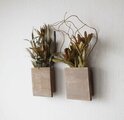 壁面に取り付けられる自家製古木風で立体感のある器にドライフラワーをアレンジしています。
