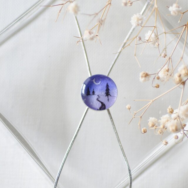 夜の道を描いた絵(原画)を樹脂でとじこめたループタイです。