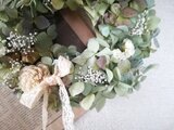 真っ白なソーラーローズと味わいのある色合いの秋色あじさい、かすみそう、スターチスのシンプルでナチュラルなリースです。